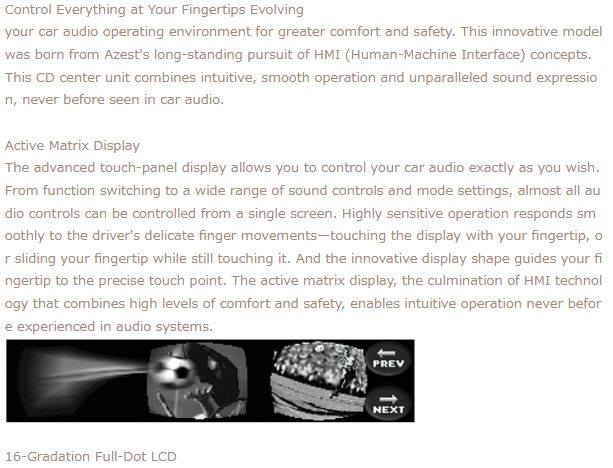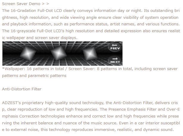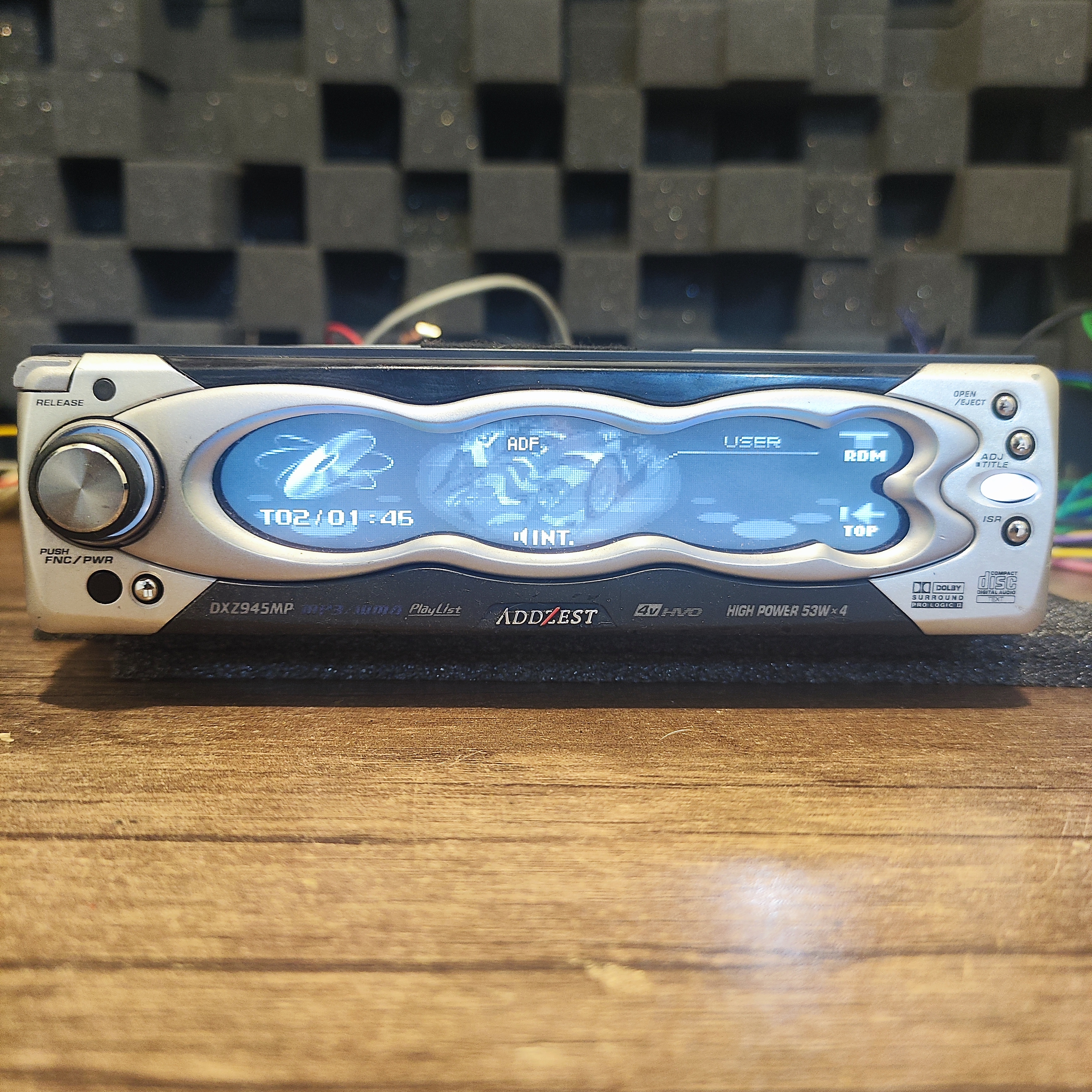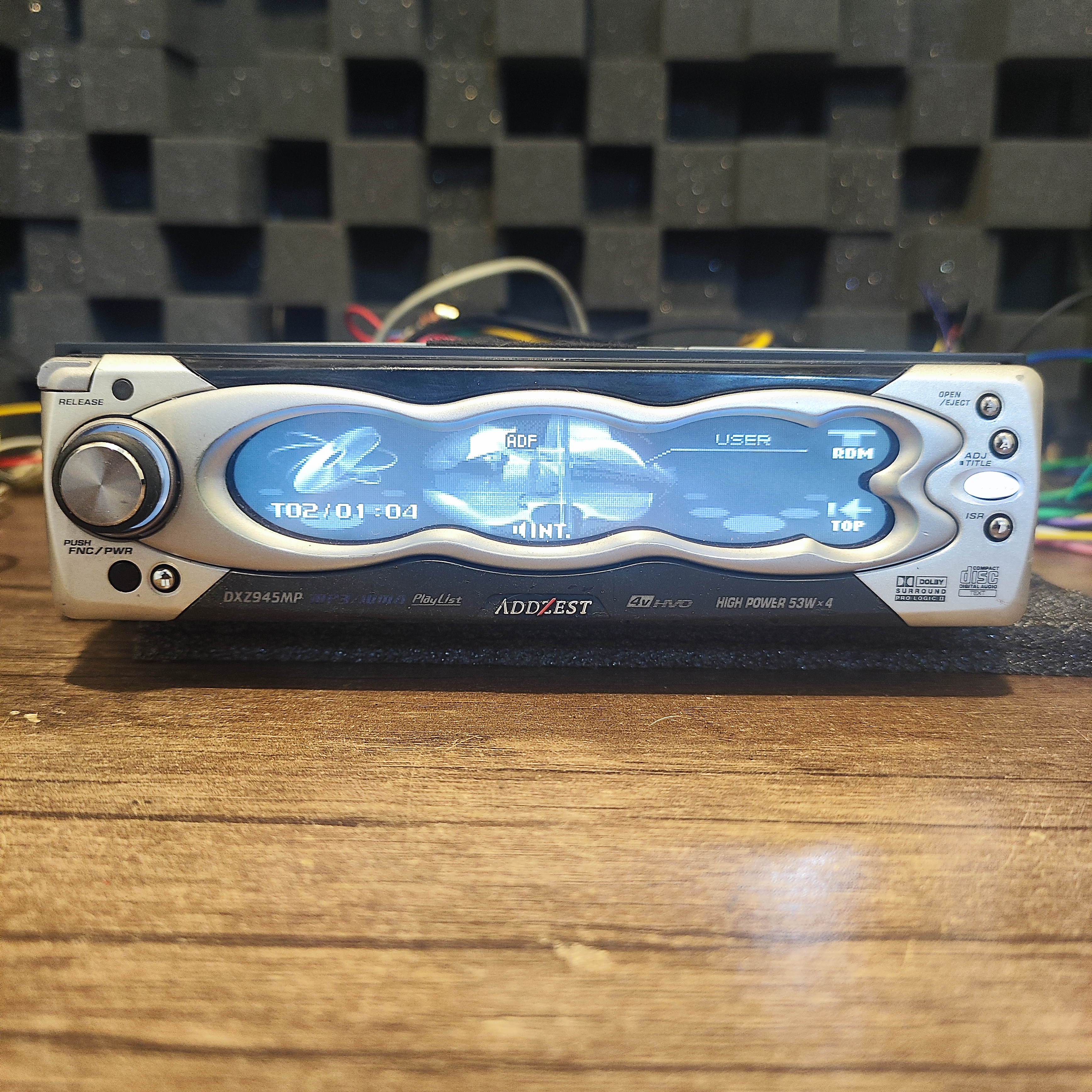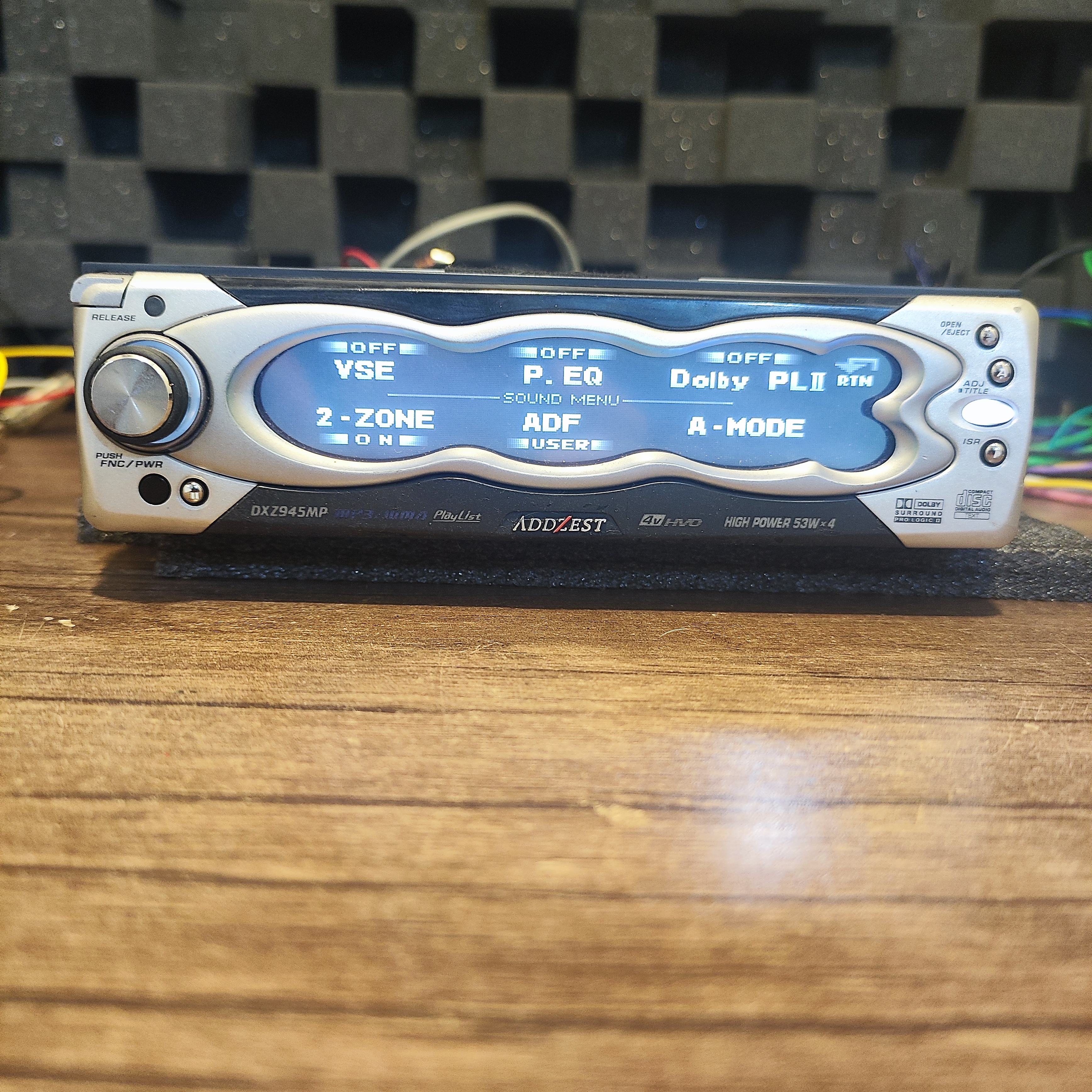 Supports playback of not only MP3 files but also the more highly compressed WMA (Windows Media® Audio) files. Enjoy over 100 songs on a single CDR/RW disc, making long drives a breeze. Playlist playback, ID3/WMA tag display with kanji support, and Romeo and Joliet long filename display are all supported. Multi-session functionality also enables playback of discs containing a mixture of CD-DA, MP3, and WMA tracks. DXZ945MP Kanji Text Support: The display for MP3/WMA files (ID3/WMA tags), CDs (CD=TEXT), and FM/AM (radio/TV station names) played on this unit can all be displayed in kanji, making it even easier to check song names and titles. 3-Band P.EQ: Adjust gain, Q (bandwidth), and center frequency for each of the three bands: low, mid, and high. You can fine-tune the sound settings to match the acoustic characteristics of your vehicle's interior and customize the sound to your preferences. The DCP (Detachable Control Panel) with Codematic Function features a blinking LED, allowing you to easily attach and detach the face panel when exiting the vehicle. This conceals the audio system when parked, helping to deter theft. The Codematic function also allows you to set a passcode to be required when attaching the DCP. Pure Aluminum Face and Power Slope Console The front face panel is made with luxurious aluminum parts. The top and bottom of the display feature a high-quality rubber feel, creating a luxurious design. The power slope console mechanism also allows the face panel to gently slide to reveal the CD slot, creating a high-grade interior. AC Processor III: The Anti-Distortion Filter enhances the entire high and low frequencies without compromising the original sound recorded on the disc, while Dolby Pro Logic II transforms any 2-channel source into a 5.1-channel experience for dynamic sound reproduction. Furthermore, "VSE" corrects for sound distortions caused by the shape of the vehicle interior, creating a high-quality acoustic environment. Furthermore, "Time Alignment" virtually equalizes speaker distances for all listeners, allowing for personalized acoustic adjustments and sound quality adjustments. Furthermore, "Parametric Equalizer" adjusts for specific frequency disturbances within the vehicle cabin and optimizes acoustic characteristics. This system is equipped with Azest's proprietary, cutting-edge digital processor, condensing advanced sound quality and sound field analysis technologies into a single chip. This makes it possible to create the ideal acoustic space in any vehicle cabin. 24-bit D/A Converter: The system is equipped with a high-resolution 24-bit D/A converter that converts digital signals recorded on CDs to analog with higher precision. This simultaneously improves sound density and clarity and reduces noise, reproducing even the subtlest sound components recorded on CDs without loss. The A/D converter is also 24-bit, pursuing even higher quality sound quality. High-Pass/Low-Pass Filter Equipped with high-pass and low-pass filters (both settings: THROUGH/50Hz/80Hz/120Hz) that allow you to set the frequency range sent to each channel, depending on the characteristics of the speakers connected to the front, rear, center, and subwoofer. By cutting out unnecessary frequency ranges to match the playback capabilities of each speaker, you can build a more advanced 5.1ch system. Amp Canceller When an external amplifier is connected, the built-in amp canceller reduces distortion and cancels the amplifier output. This function is effective when upgrading your system.