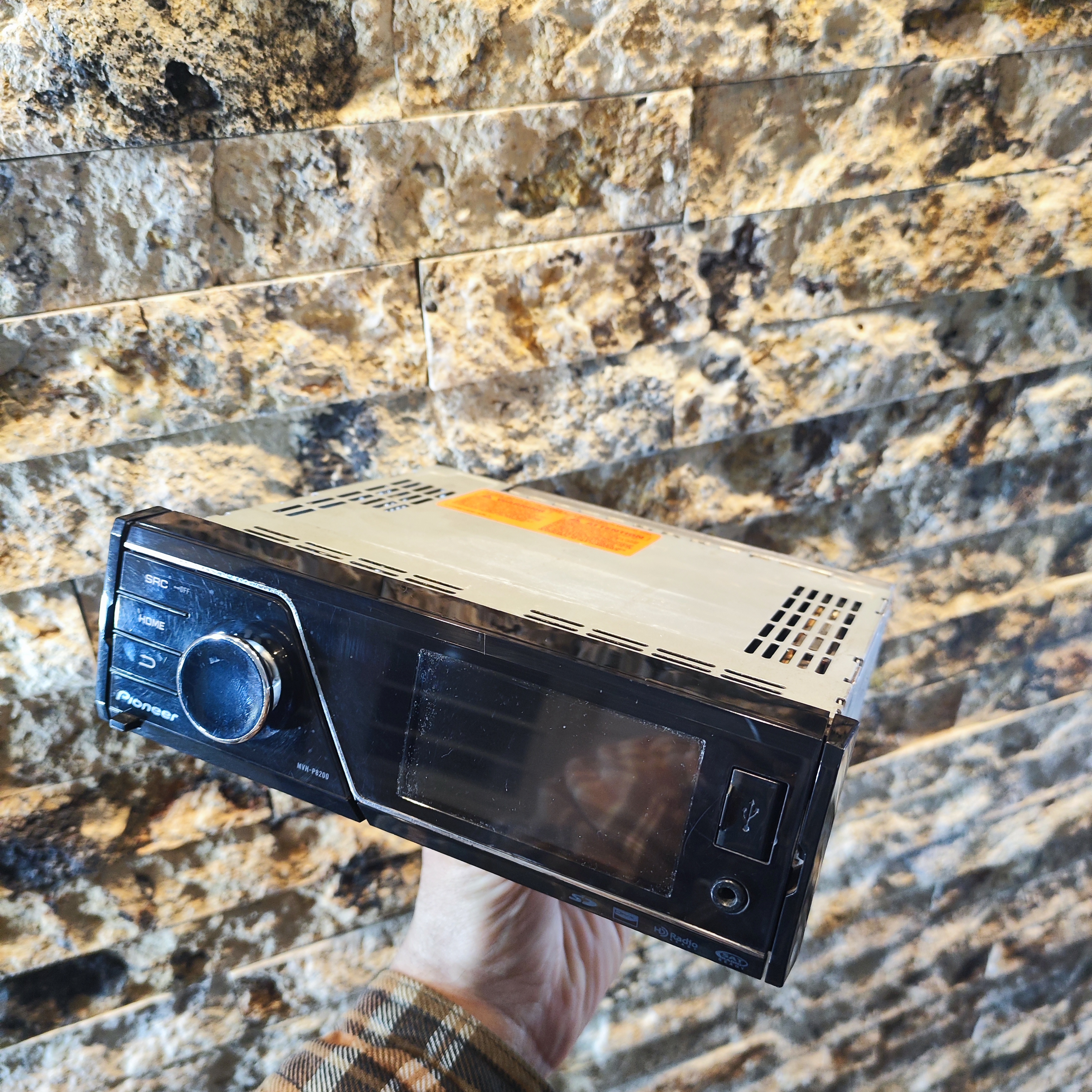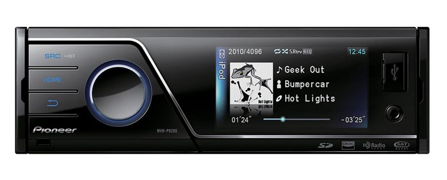Overview: The Pioneer MVH-P8200 is a multimedia receiver with built-in AM/FM tuner and 50-watt (peak) MOSFET amplifier. The MVH-P8200 multimedia receiver is equipped with a front-panel USB port and SD-card slot for playback of MP3/WMA/AAC audio files, JPEG still image files, and DivX video files. The MVH-P8200 also offers iPod/iPhone control and Bluetooth connectivity (with optional module). In addition, the multimedia receiver is Satellite Radio and HD Radio ready (optional tuner required). For further convenience, the MV-HP8200 comes with an IR wireless remote control and offers factory steering remote control compatibility (optional adapter required).
